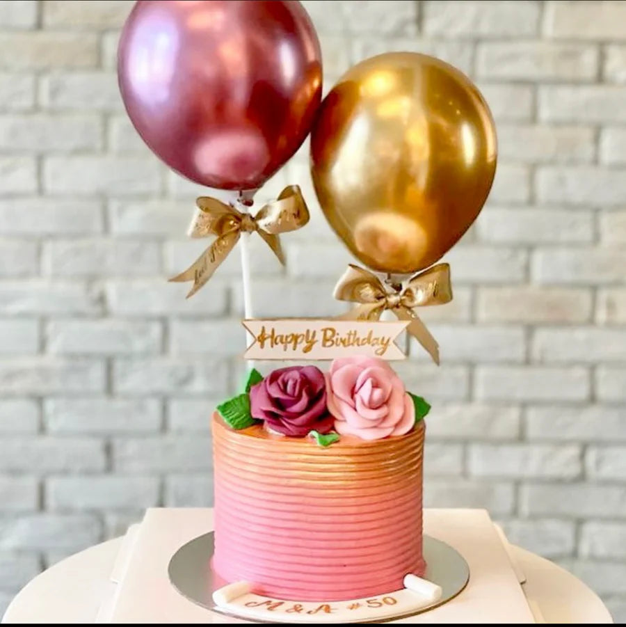 Surprise them with a cake that they won’t be able to resist! This alluring cake is composed out of a sponge base (in a flavor of your choosing), and features beautifully designed with golden and red metallic color chrome balloons with confetti and roses on top and pink & gold icing which is creating an irresistible treat for your recipient!