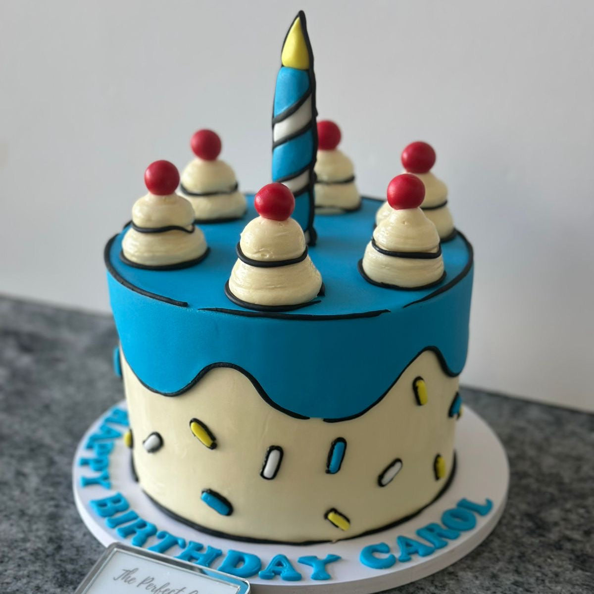 Delight their eyes and taste buds with this fun cartoon cake! This gorgeous cake features pink icing with cherries and candle with a sponge cake in either vanilla, chocolate or red velvet (you choose the flavor and the filling!)