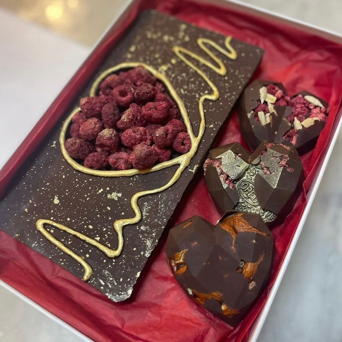 These delicious tasty & beautiful 3 choco-smash heart made from our premium Swiss chocolate mixed with oreos, dried nuts & raspberries. in addition to a 100 grm bar with dried raspberries in shape of a heart! Perfect for gifting loved ones on their birthday or special occasion.