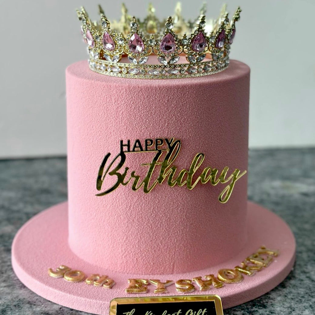 An Elegant pink cake with velvet finish topped with a pink crystals crown,  Perfect gift for your princess or queen! All our cakes are made from premium ingredients from Europe and Swiss chocolate making it light in texture yet full of flavor!