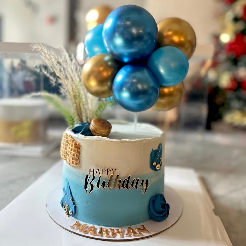 Featuring a beautifully designed blue color chrome balloons with confetti on top and blue white color icing with hint of gold creating an irresistible treat for your recipient!