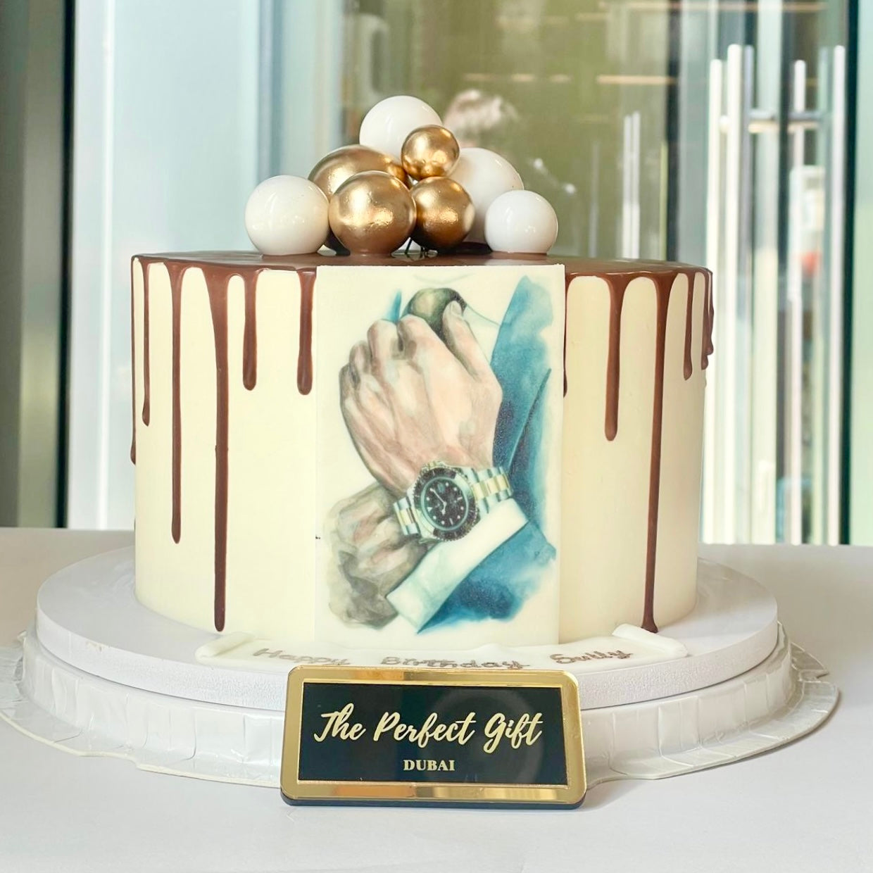 An Elegant cake with man hands in suit wearing watch drizzled with chocolate and topped with spheres and age ! Perfect gift for him, your husband, boyfriend, father, friend or any recipient! Perfect for Birthday, Anniversary or any special occasion!