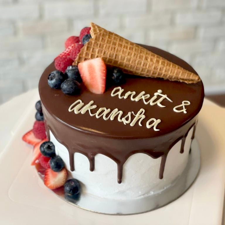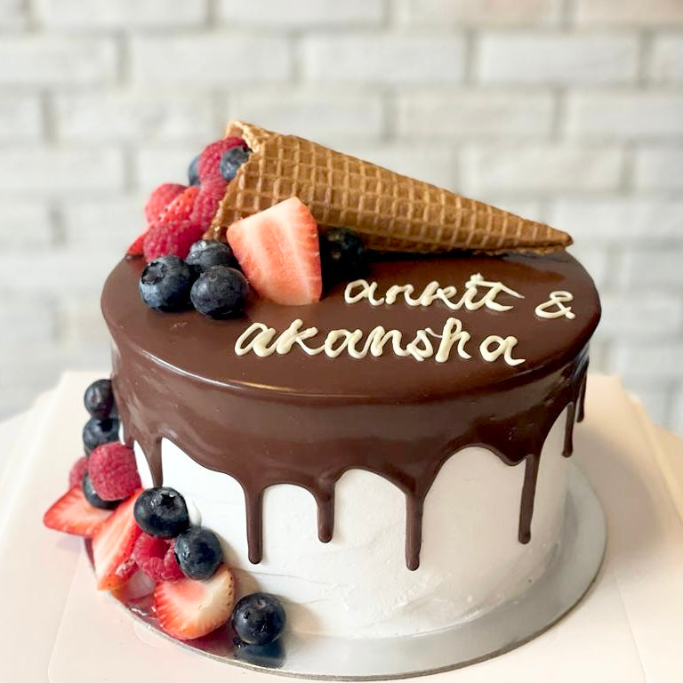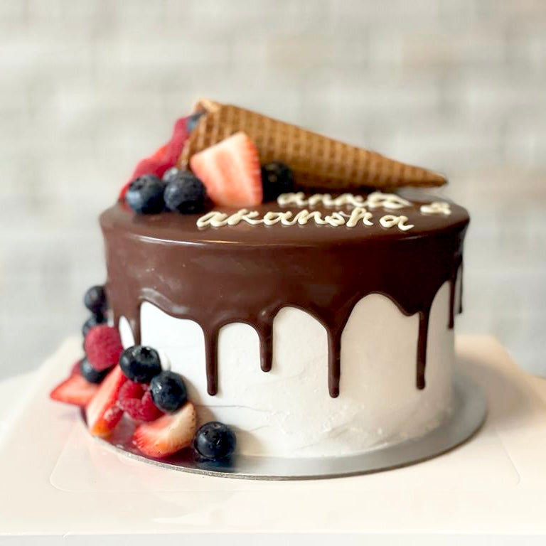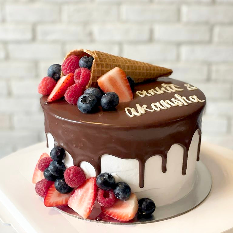 Surprise them with a cake that they won’t be able to resist! This alluring cake is composed out of a sponge base (in a flavor of your choosing), and features fresh strawberries, berries and cone wafer on top and chocolate icing that gracefully drips down the sides on pink cake, creating an irresistible treat for your recipient!