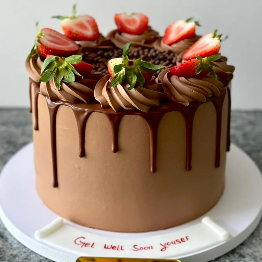 Surprise them with a cake that they won’t be able to resist! This alluring cake is composed out of a sponge base (in a flavor of your choosing), and features fresh strawberries on top and chocolate icing that gracefully drips down the sides on pink cake,creating an irresistible treat for your recipient!