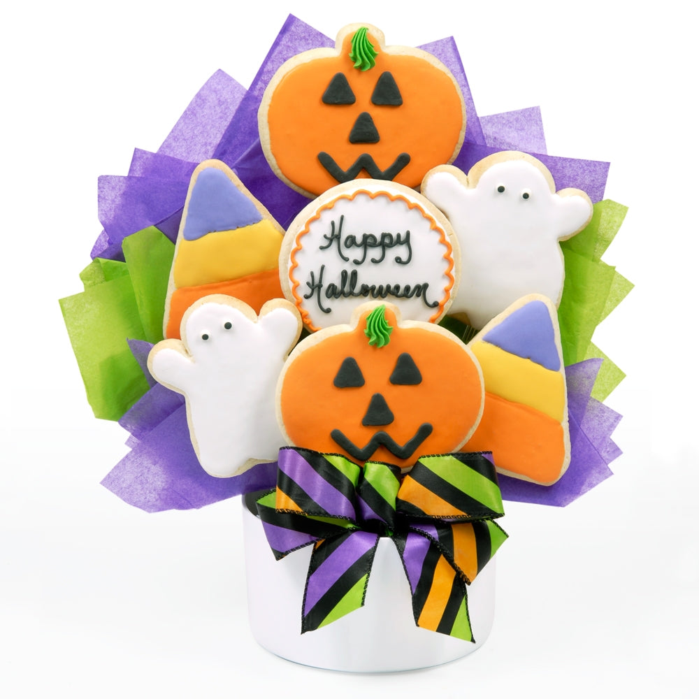 Trick or Treat! Celebrate this Halloween with a spooktacular cookie bouquet! Featuring 7 fun decorated cookie creations of Jack O Lantern pumpkins and ghastly ghosts, all carefully arranged in a vase.