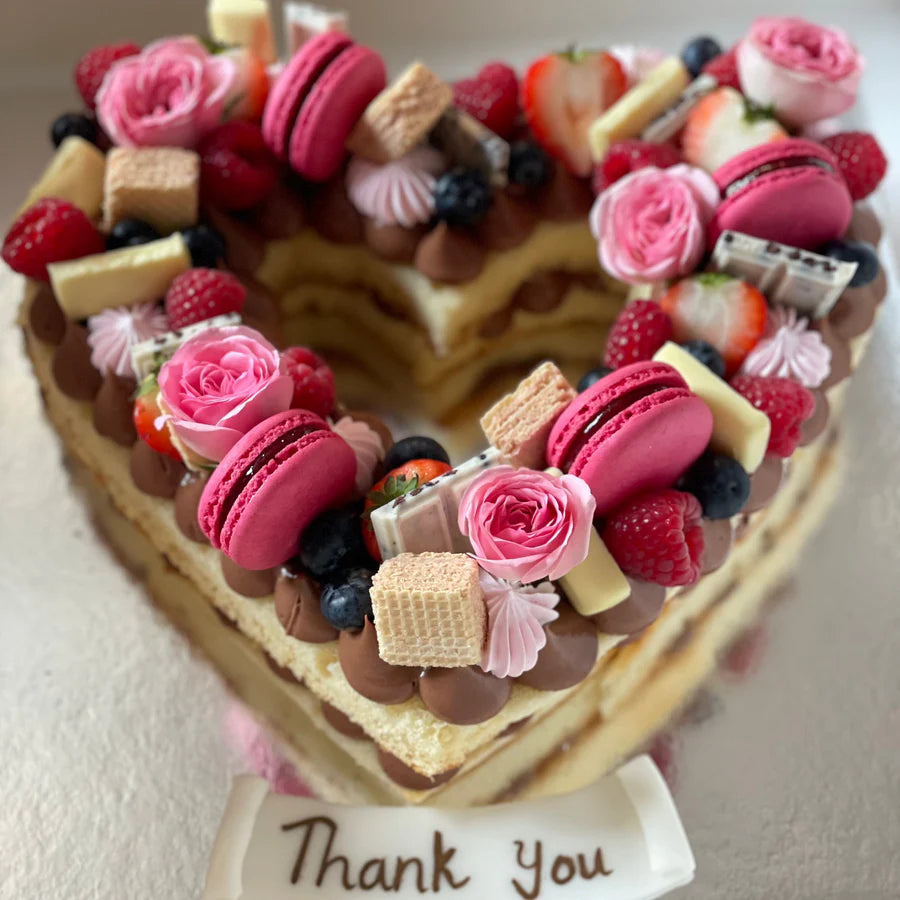 Win their hearts and surprise them with this magical Heart Cake! This gorgeous creation is composed of sponge cake in the shape of a heart, with dollops of delicious cream on top of the cake. The delectable treat is topped off with an amazing arrangement of sliced fresh juicy strawberries, meringue cream, raspberries, blueberries, pink wafers and macarons, white chocolate, and finally completed with dashing pink daisies.