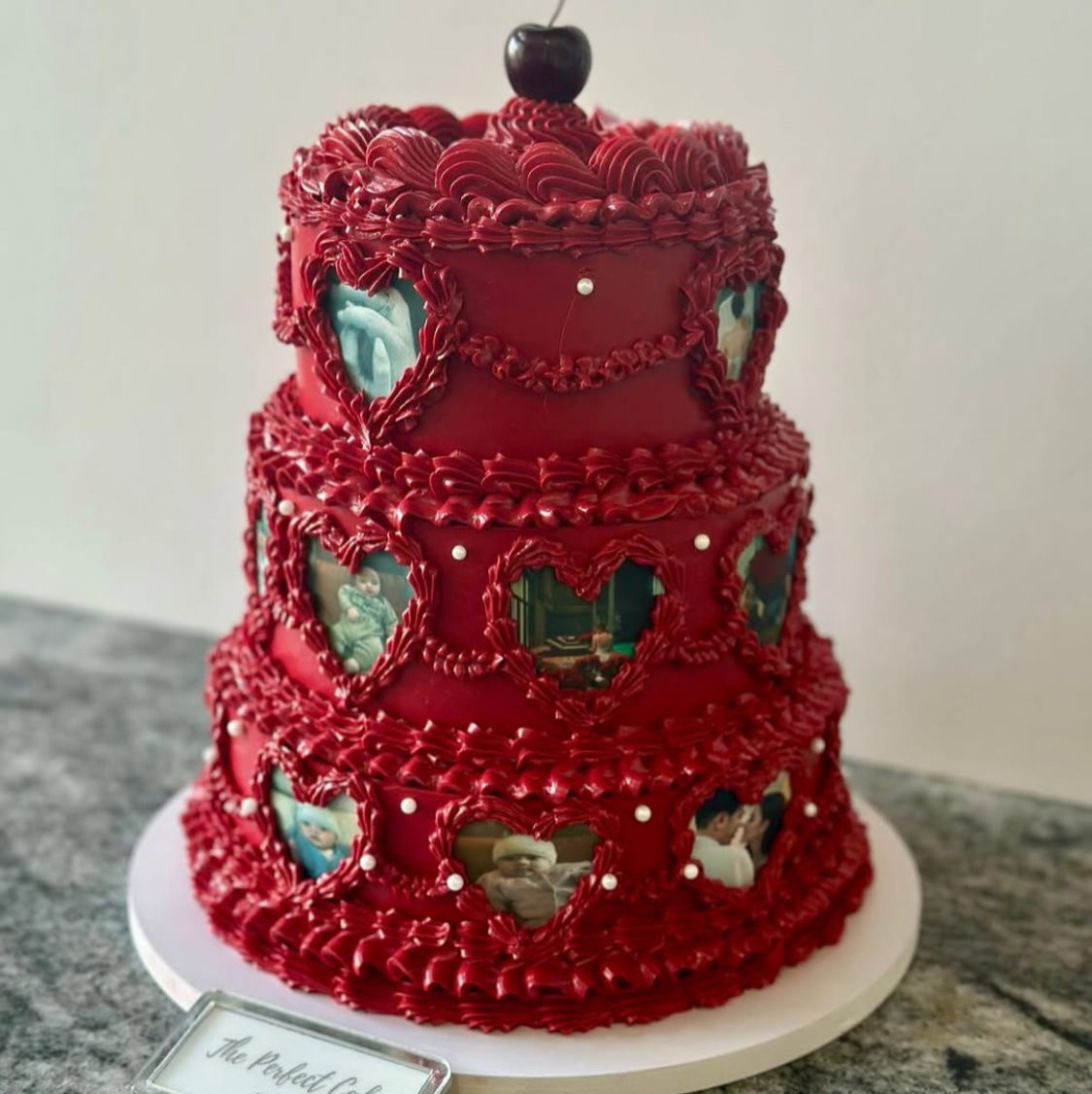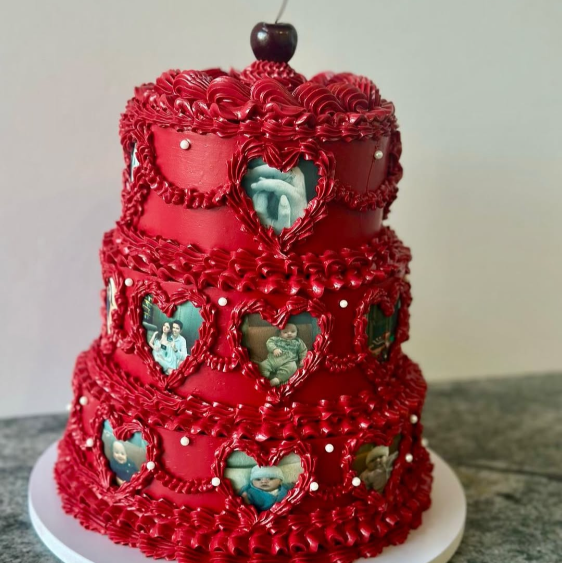 Send your best wishes with this trendy Cake! This elegant creation is composed of sponge cake in red cherry color with elegant piping and decorated with photos in heart frames on the sides, and finally with a cherry on top.