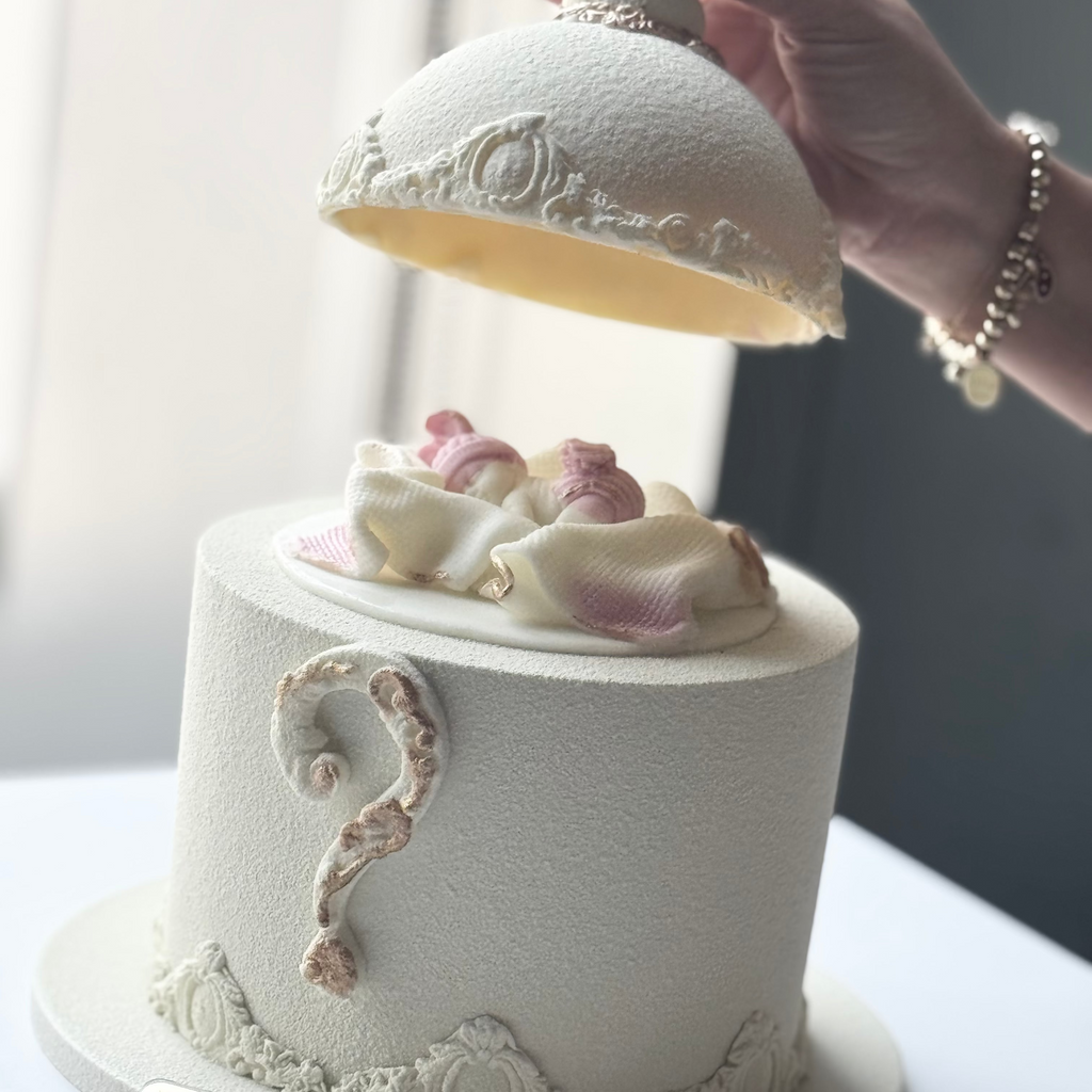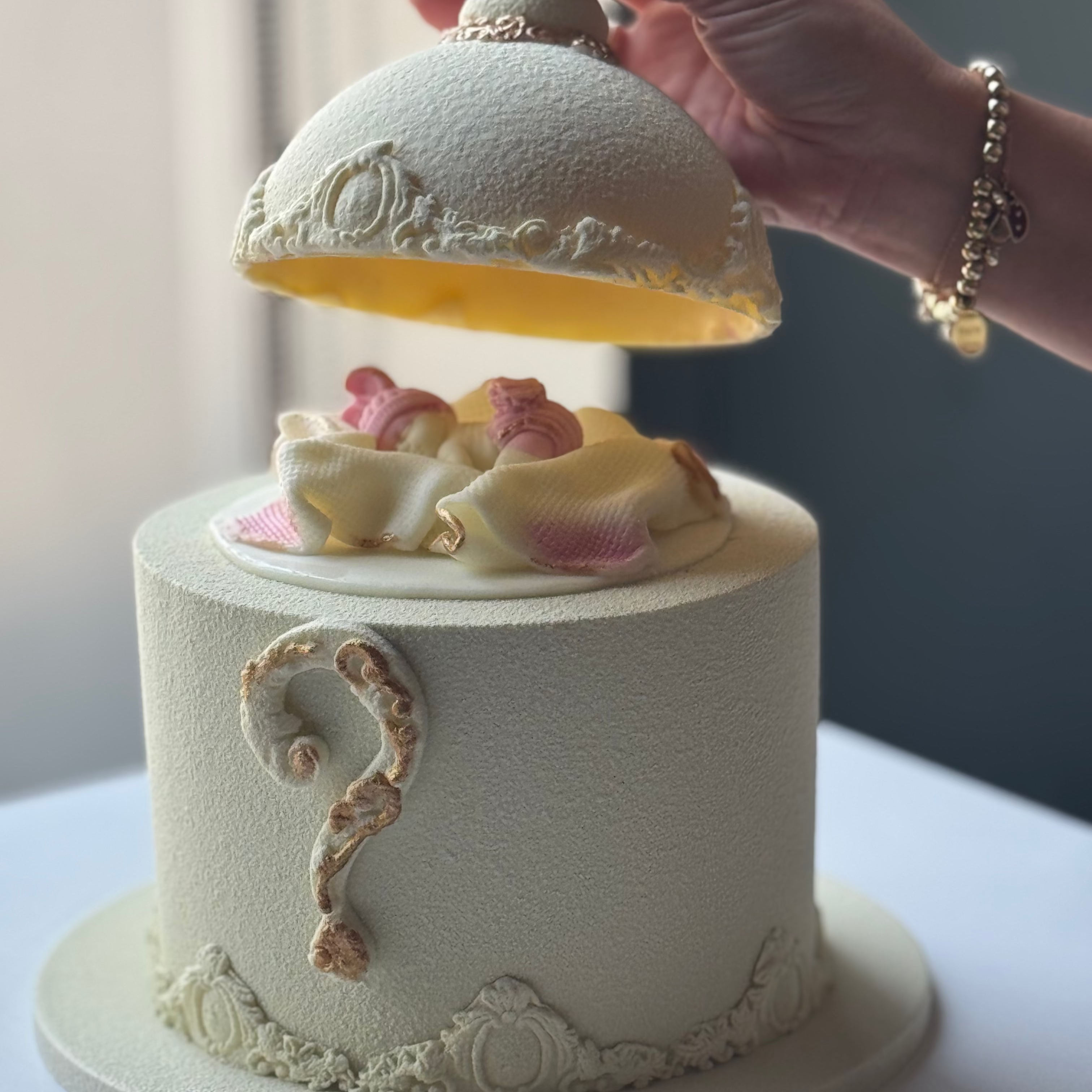 Surprise them with this elegant cake with color of gender hidden inside the dome in a form of a sleeping baby on blanket! Made with Swiss chocolate and premium ingredients, This alluring cake is composed out of a sponge base & cream fillings of your choice. This gender reveal cake is a fun elegant way to find out if it’s a boy or a girl and is presented in white velvet textured theme cake with a golden question mark on the side.