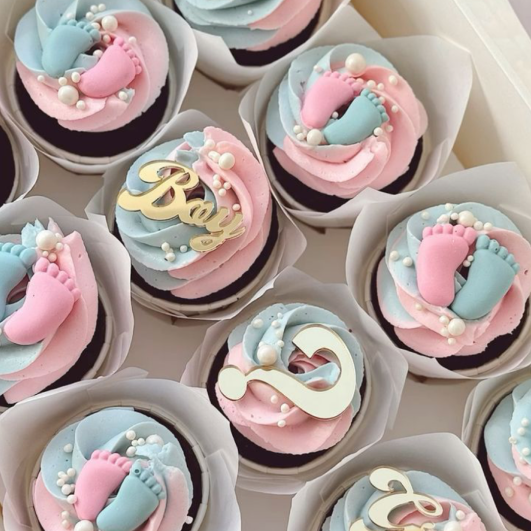 Reveal the baby’s gender through these absolutely delicious cupcakes, with a surprise waiting inside! Bite into these delectable cupcakes to reveal a blue or pink filling for the baby’s gender. These tasty cupcakes feature a chocolate, vanilla or red velvet sponge cake and is topped off with buttercream frosting that reads ‘boy ? girl’ with matching ribbons and bows in an elegant design on sugar paste. These cupcakes are perfect for surprising the lucky mom-to-be, or for a baby shower or gender reveal party!