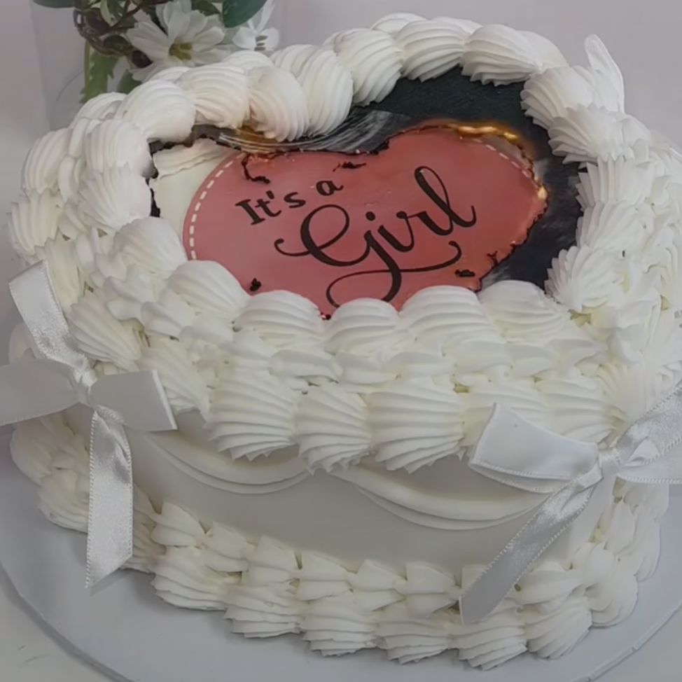 Surprise them with this elegant piped white cake with color & gender hidden below the burnout image of ultrasound! Made with Swiss chocolate and premium ingredients, This alluring cake is composed out of a sponge base & cream fillings of your choice. This gender reveal cake is a fun elegant way to find out if it’s a boy or a girl!