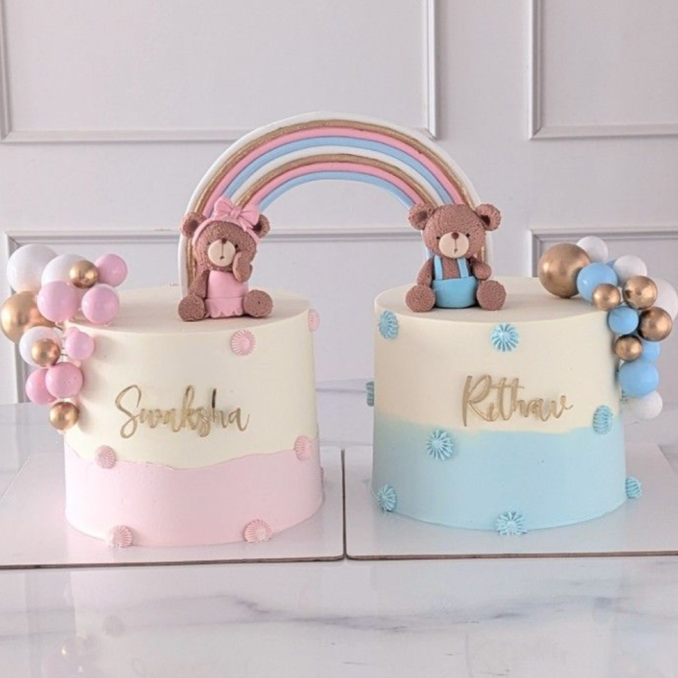 Surprise them with this 2 adorable teddy themed cakes connected with pastel rainbow! Made with Swiss chocolate and premium ingredients, This alluring cake is composed out of a sponge base & cream fillings of your choice. featuring a girl and boy teddy in pink and blue with balls and connected with a rainbow.