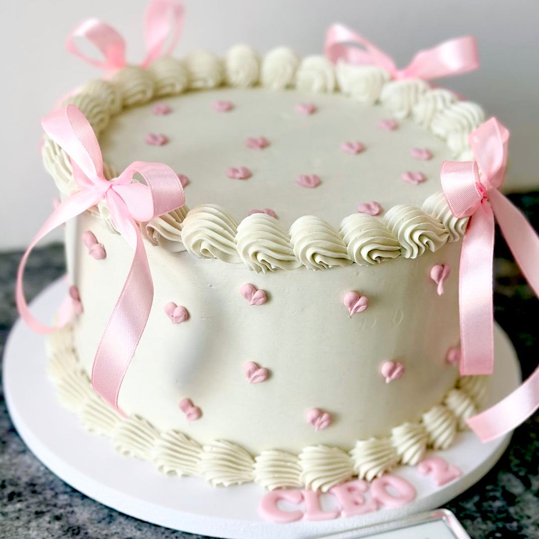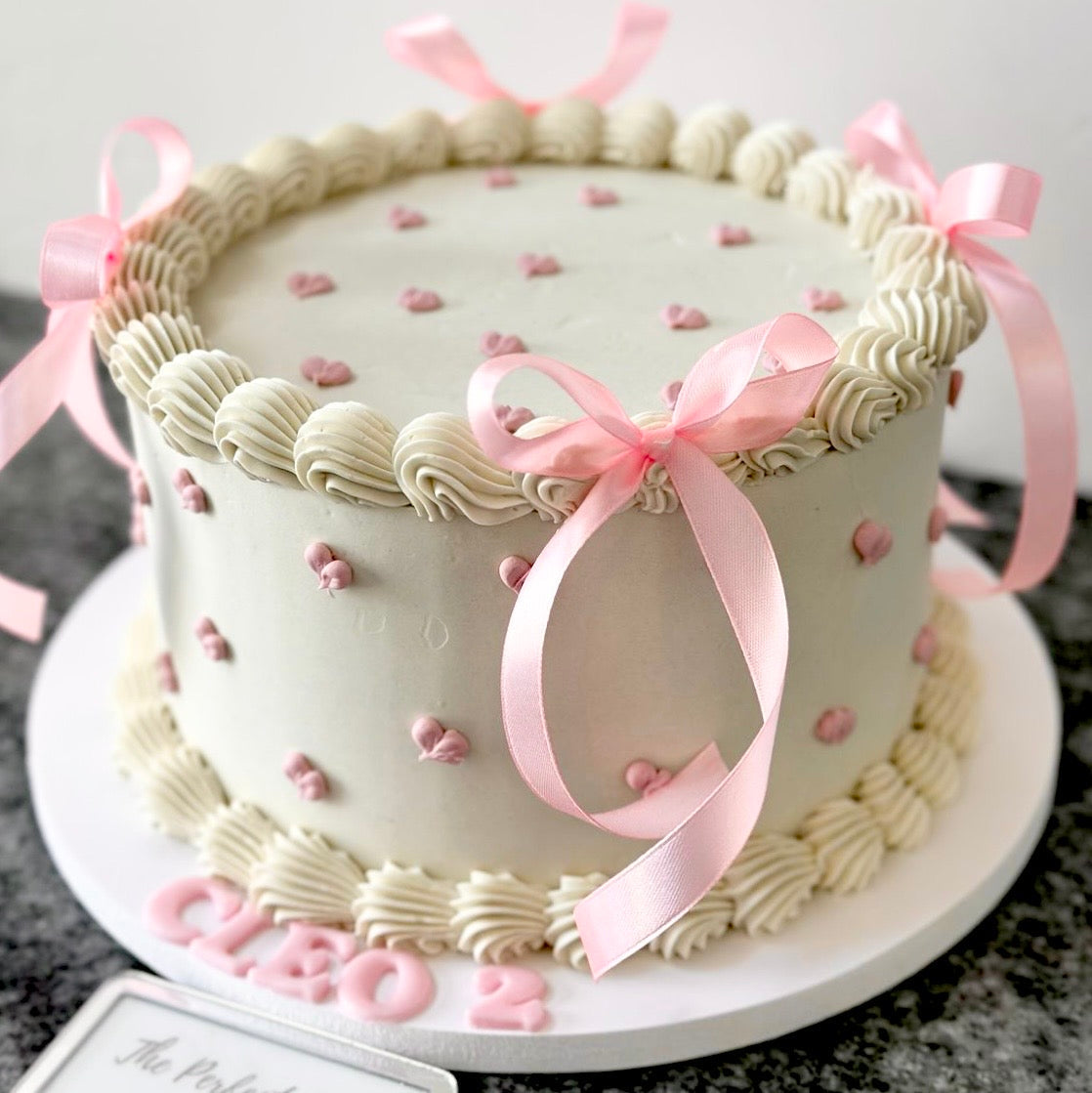 Surprise them on their pecial day and send them this elegant piped cake decorated with bows & min hearts! Baked fresh on order and using the highest quality ingredients & chocolates from Switzerland and Europe, this cake is composed of a sponge base in a flavor & filling of your choice. The cake is light and fluffy yet full of flavor making you want to have another piece!