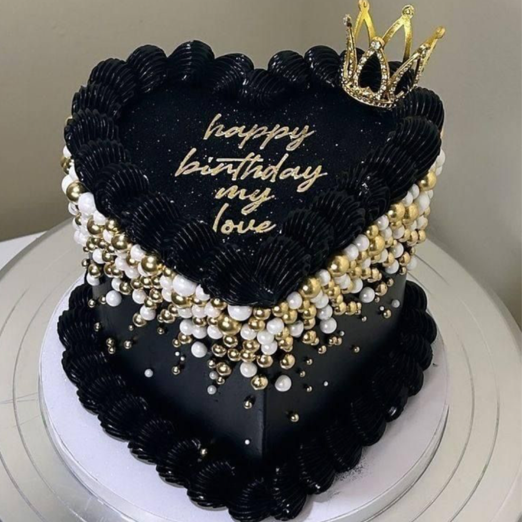 Send your best wishes with this trendy Heart Cake! This gorgeous creation is composed of sponge cake in the shape of a heart, in black with elegant piping design on top of the cake and finally decorated with edible glitter sparkling & shining the cake & pearl & crown.