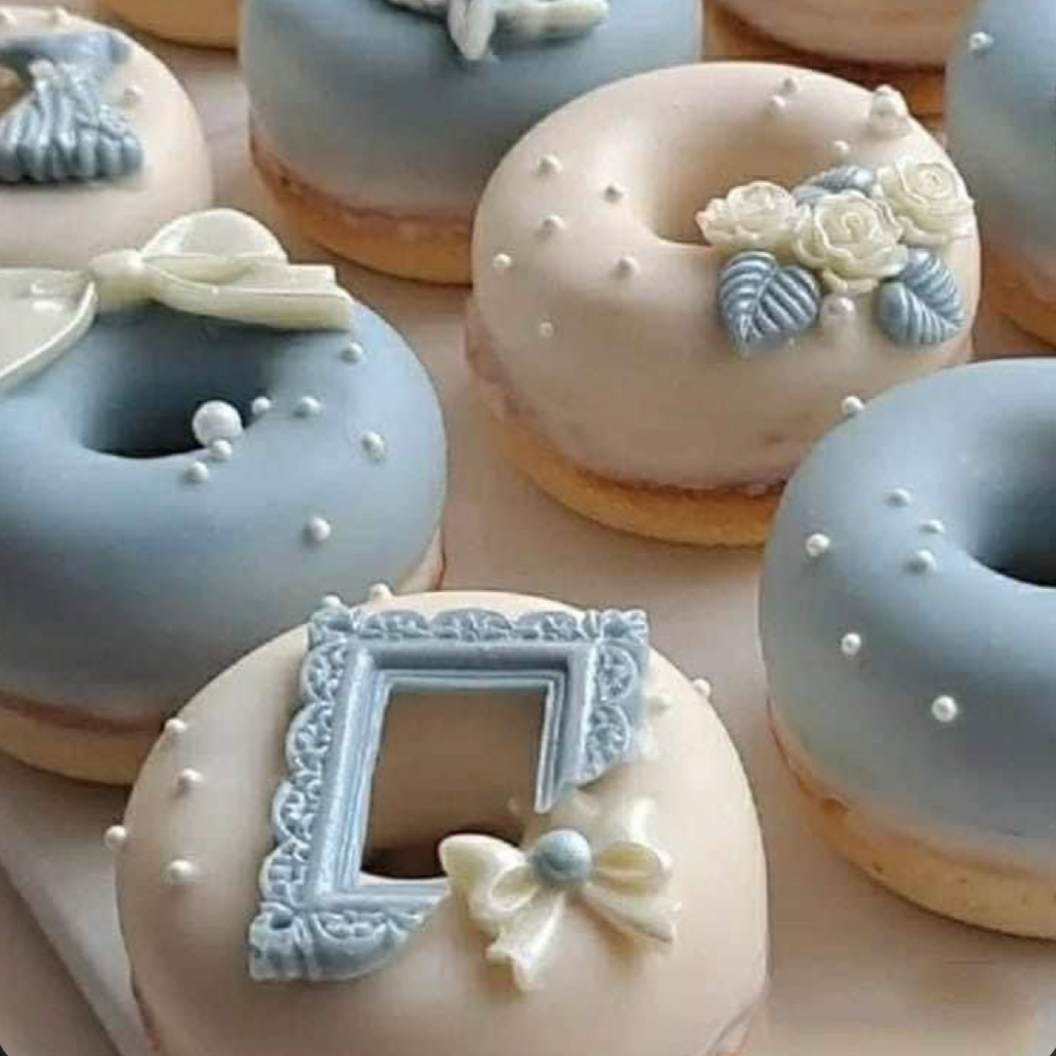 These donuts are dipped in white royal icing and decorated with edible pearls, bows, photo frames & roses. Very elegant and royal treats.