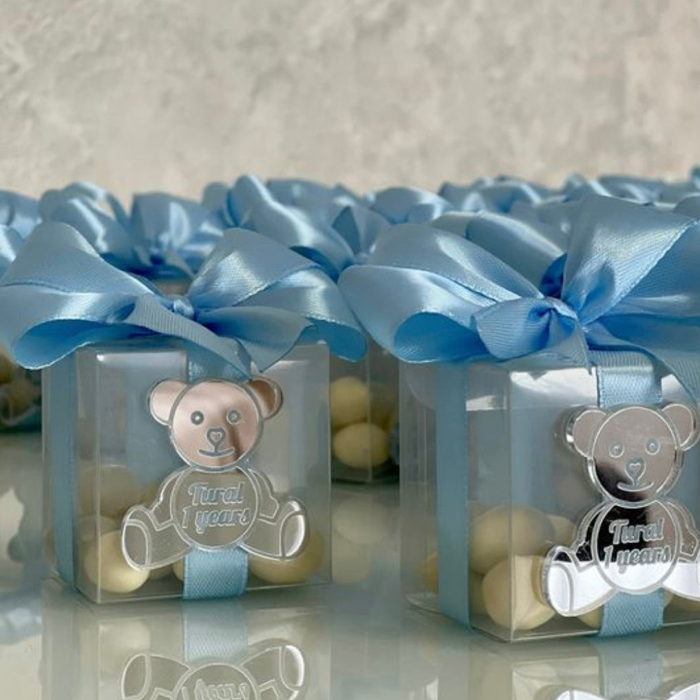 Complete your baby shower or new born baby celebration with these elegant candy almonds giveaways for your guests which can be customized with their name on acrylic Teddy Bear or any other theme you prefer. It is then wrapped with tulle and completed with an elegant ribbon in the color of your choice. Choose to send these giveaways with or without tags,or along with a personalized ribbon at an extra cost.