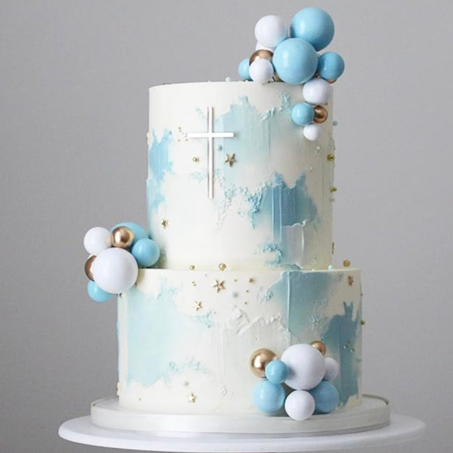 Decorate & complete your venue decoration with this elegant white & blue Baptism cake! Made with Swiss chocolate and premium ingredients, This alluring cake is composed out of a sponge base & cream fillings of your choice.